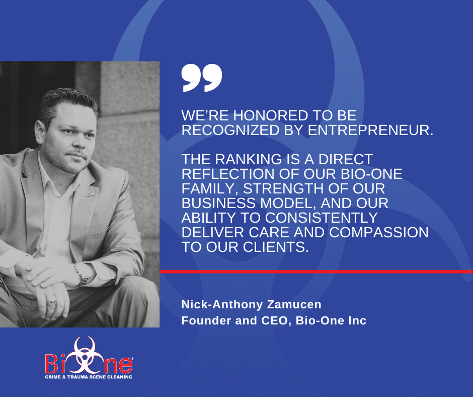“We’re honored to be recognized by Entrepreneur,” said Nick-Anthony Zamucen, CEO of Bio-One Inc. “The ranking is a direct reflection of our Bio-One family, strength of our business model, and our ability to consistently deliver care and compassion to our clients.”
