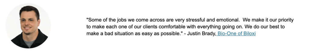 This is a core mentality of the Bio-One motto Help First, Business Second. Crime scene cleaning is an industry where you know you are making a positive difference in people’s lives, and you will have the opportunity to help people in their greatest time of need. It's as close to being a hero on a day-to-day basis as you can get.